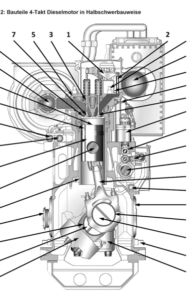 Beschrieben werden die Unterscheidungsmerkmale, die Fachausdrücke und die Bauteilgruppen von Dieselmotoren. Ferner werden der Abgasturbolader, das 2-Takt- und das 4-Takt-System erklärt.