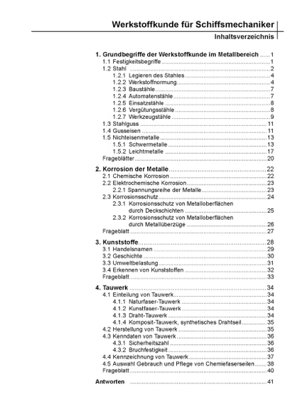 Neben den Grundbegriffen der Werkstoffkunde im Metallbereich, werden die Korrosion von Metallen, der Korrosionsschutz, die Kunststoffe und das Tauwerk angesprochen.
